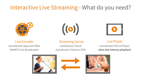 - nanoStream WebRTC.live: browser-based live encoding/publishing for WebRTC-enabled browsers, easily added to nanoStream Cloud