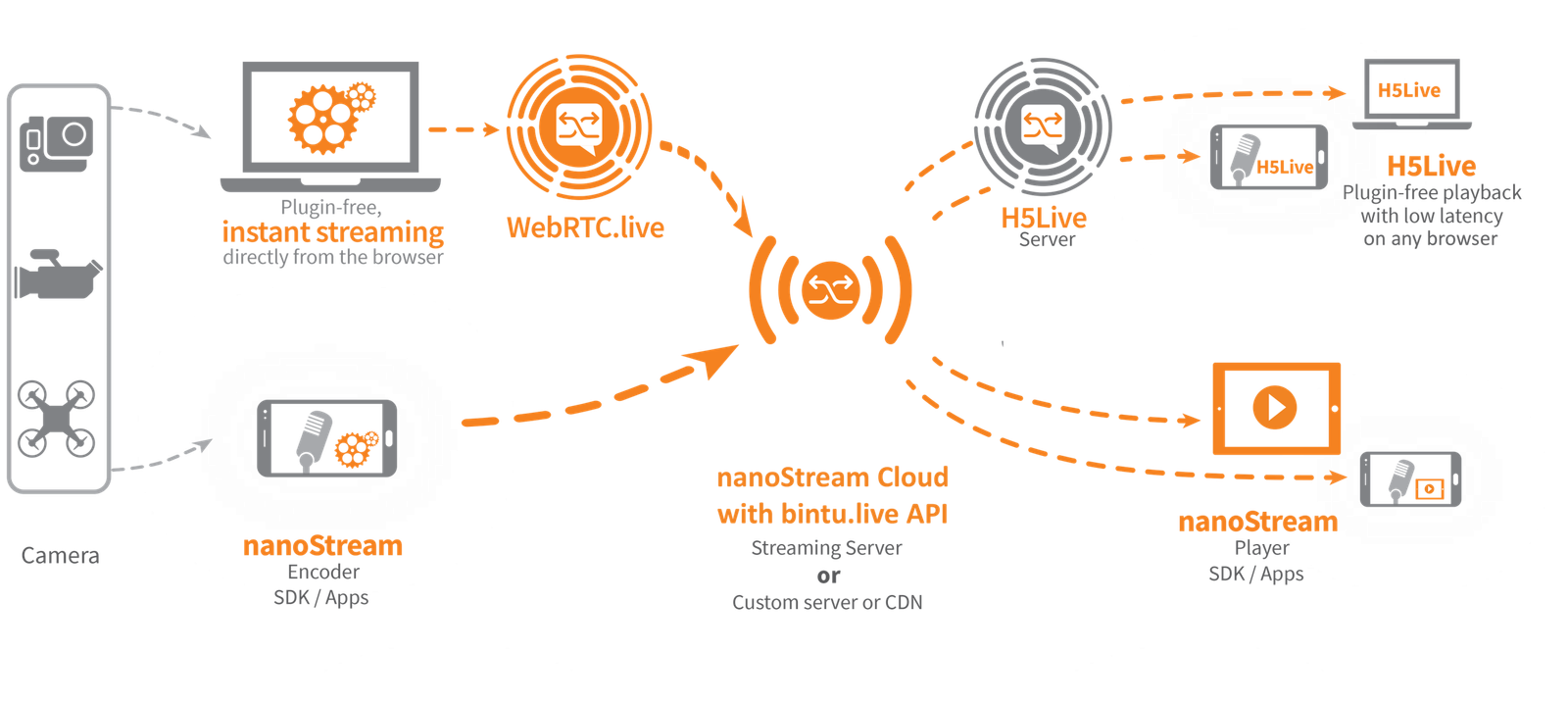To create a live stream from a camera, you need a Live Encoder. It sends a live stream to a server in nanoStream Cloud, which does the delivery in ultra-low-latency to your audience and playback with nanoStream H5Live.
