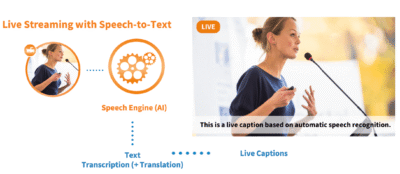 Our kick off on the AI world employs automatic speech recognition, providing real-time captions for your live streams, such as webcasts and townhall meetings. This is based on our new AI-powered speech engine for live transcripts (speech to text) and multi-language live translation. This innovation promotes accessibility and inclusivity, ensuring that your content reaches a broader audience. All based on the global nanoStream Cloud services, with privacy and security under full control.