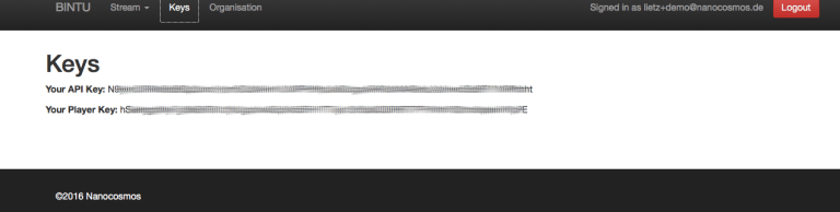 • Under Keys you will find your account’s API Key and Player Key to manage live streams within your own application.