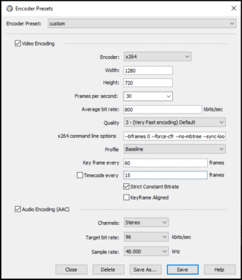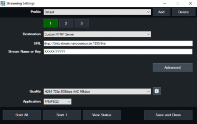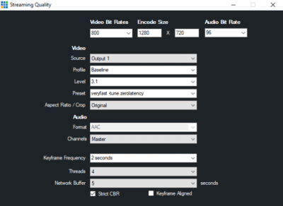 5) Select a Quality profile, i.e. h264 720p 800kbps AAC 96kbps