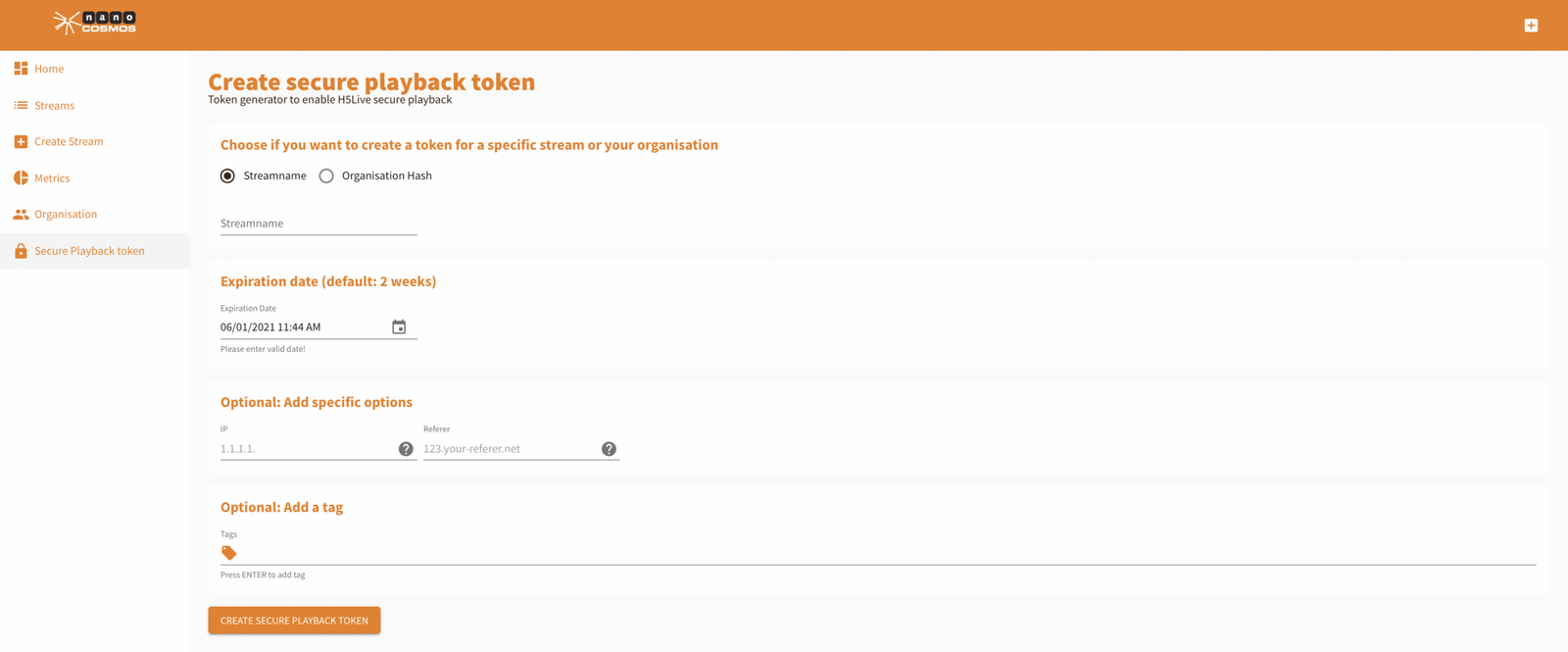 Screenshot of the nanoStream Cloud Dashboard to create, monitor and manage streams.