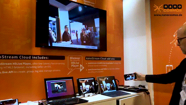 This demo is done with our nanoStream Cloud production system without any tuning. Live encoding is done with an iPhone, Live playback with nanoStream H5Live player across different devices and browsers. Other camera/live encoder combinations get similar results (for example JVC connected camera or browser based live encoding with a webcam). You can see we go live around the world in about 1 second!