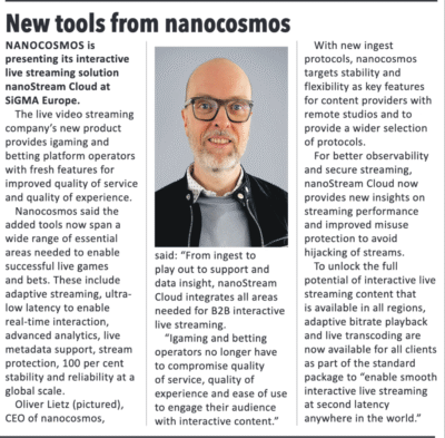 These include adaptive streaming, ultralow latency to enable real-time interaction, advanced analytics, live metadata support, stream protection, 100 per cent stability and reliability at a global scale. Oliver Lietz (pictured), CEO of nanocosmos, said: “From ingest to play out to support and data insight, nanoStream Cloud integrates all areas needed for B2B interactive live streaming. “Igaming and betting operators no longer have to compromise quality of service, quality of experience and ease of use to engage their audience with interactive content.” With new ingest protocols, nanocosmos targets stability and flexibility as key features for content providers with remote studios and to provide a wider selection of protocols.
