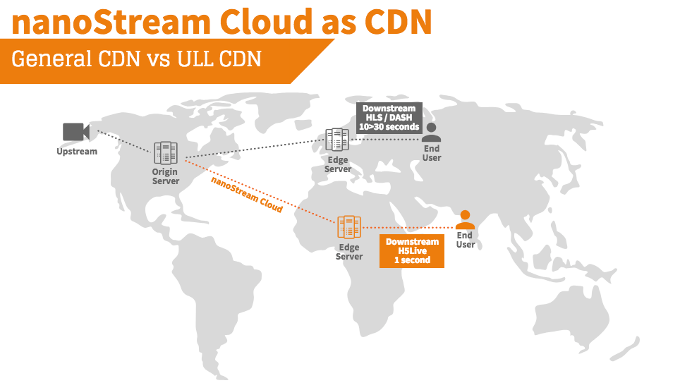 Content delivery networks, a.k.a CDNs, ensure that content reaches every corner of the world without buffering or interruptions. If interactivity is key to your use case, we’d suggest going with an ultra-low-latency CDN like nanoStream Cloud that supports sub-second streaming.